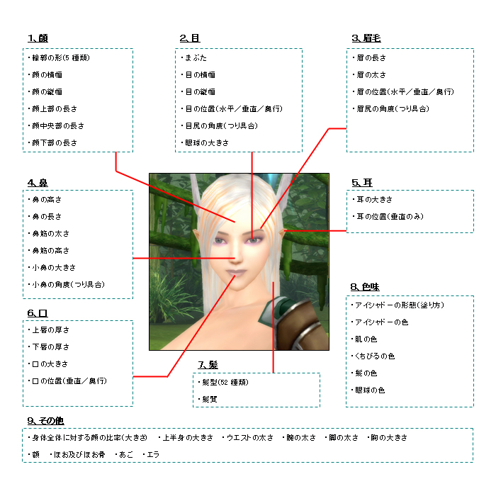 口/眉毛/化粧/体つき/肌の色等、